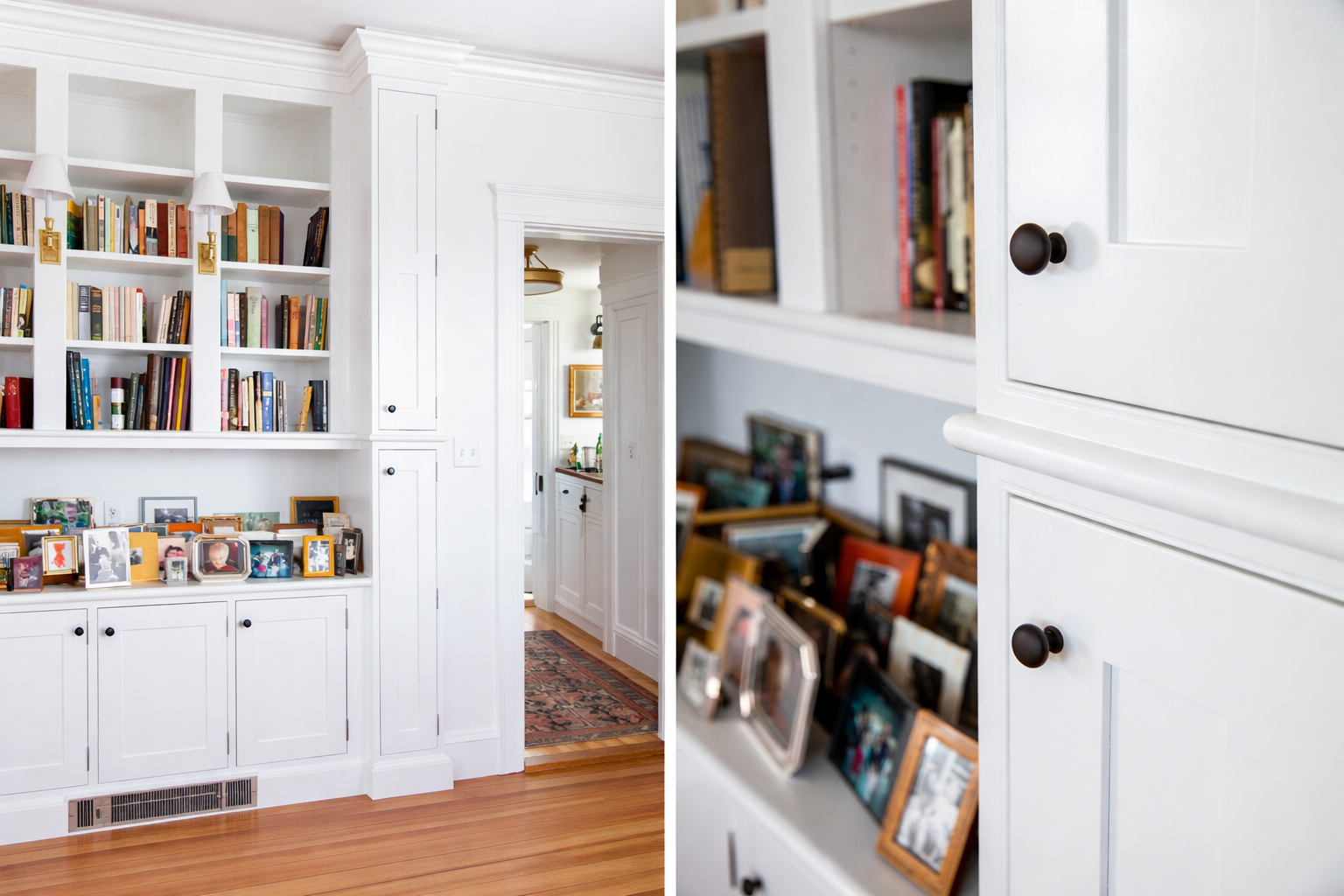 - Custom library built-ins designed to restore function, symmetry, and architectural character within the main living spaces