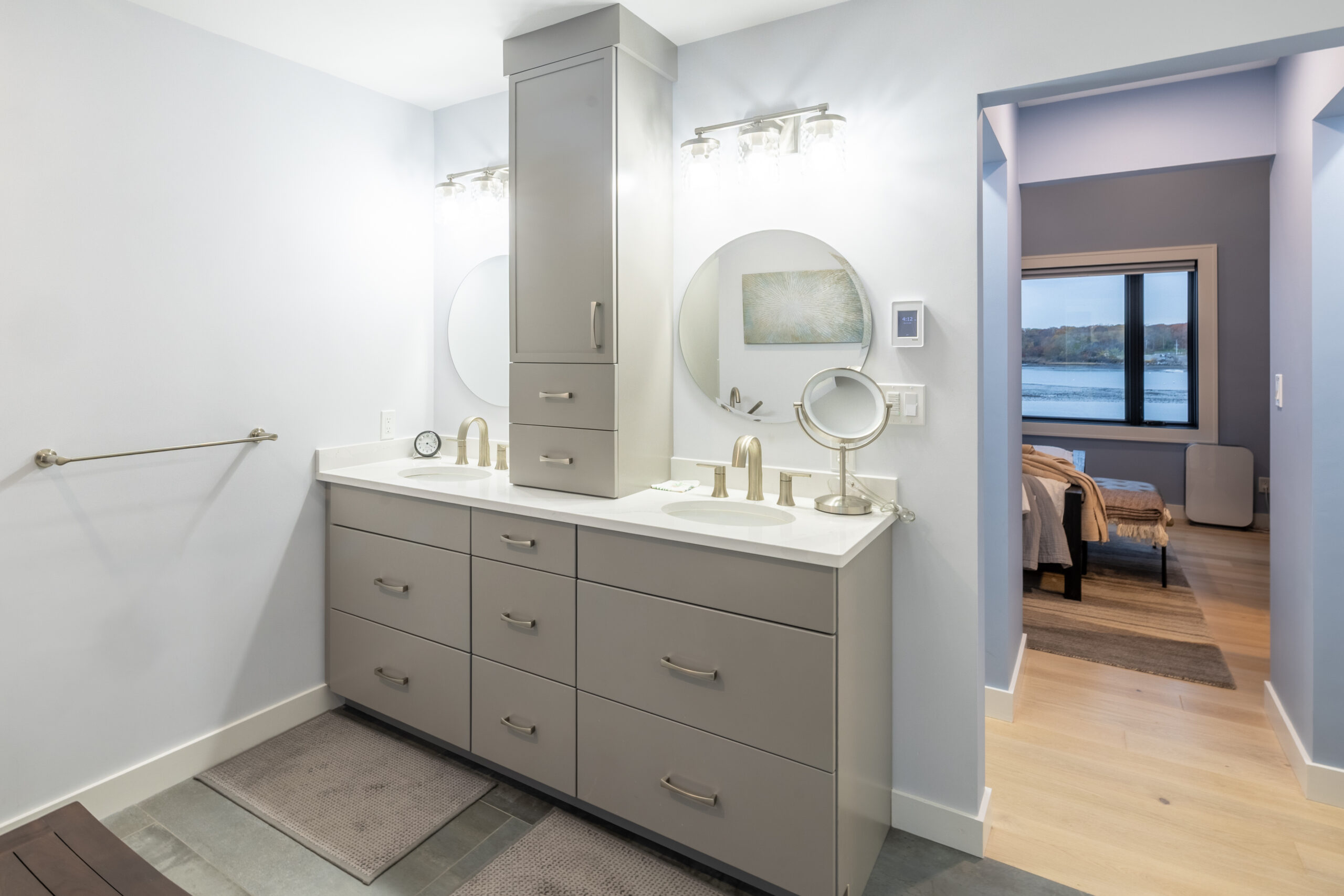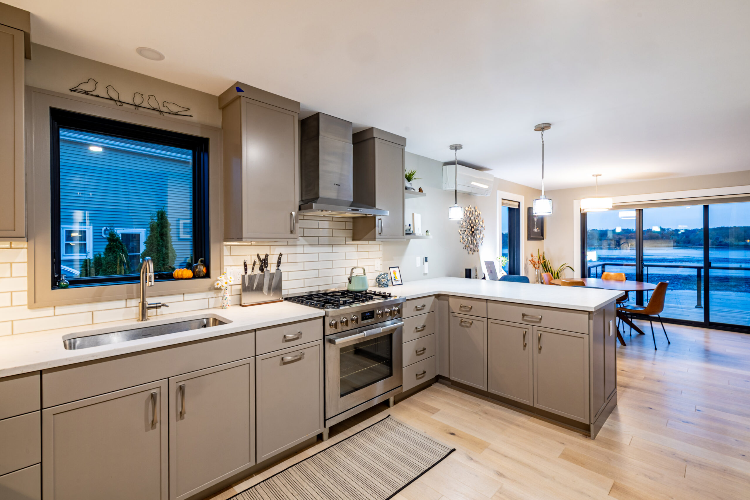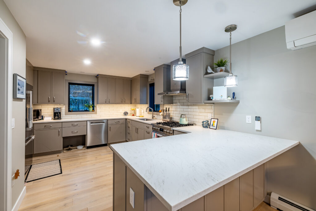 Yes—we specify properly sealed cabinetry, durable stone surfaces, moisture-managed assemblies, and ventilation planning designed to perform reliably through salt air exposure and seasonal humidity shifts.