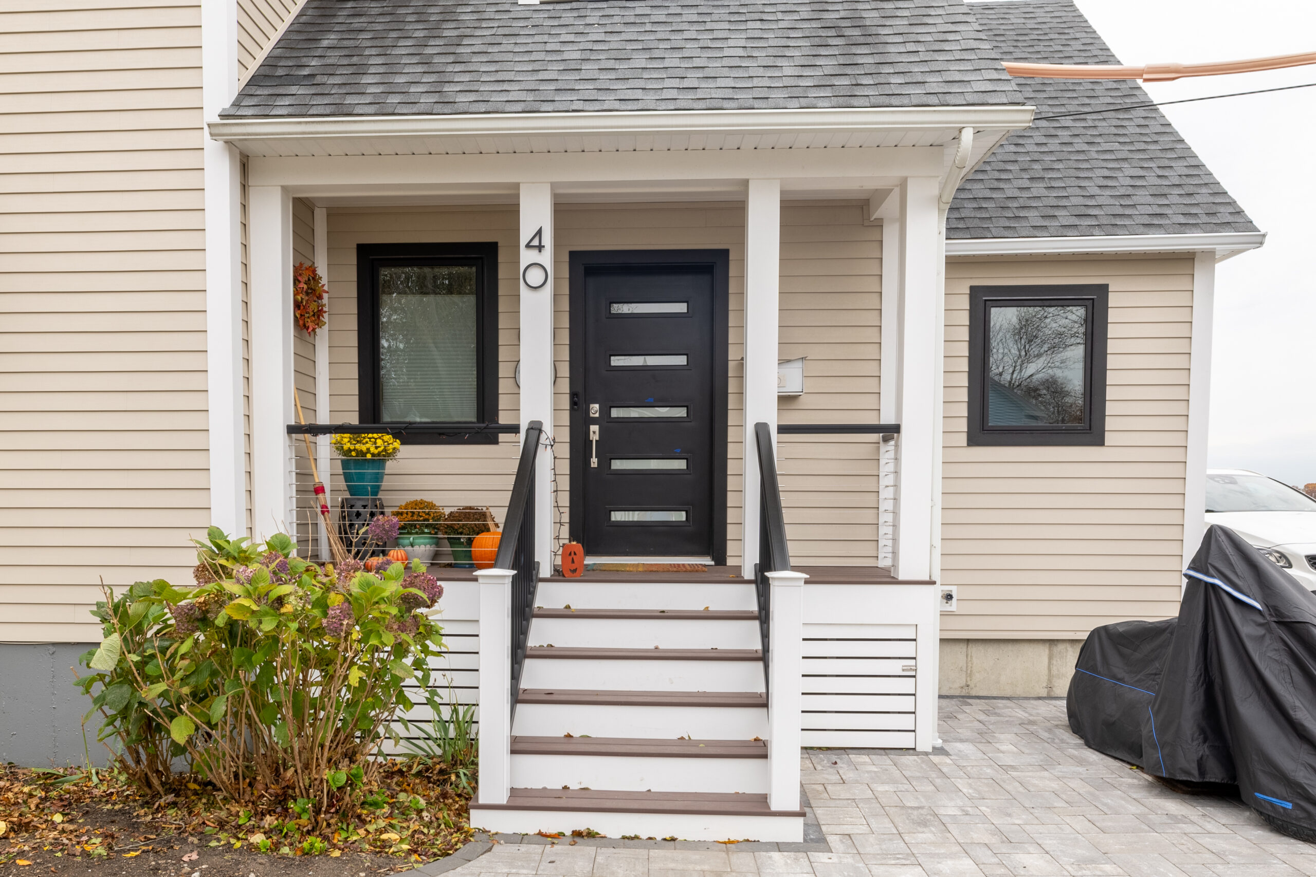 - Highlights: New mudroom addition, below-grade finished basement expansion, extended driveway over a concrete deck system, excavation and full foundation work, permeable pavers, Everlast siding, composite decking and cable railings, Marvin basement sliders, spray foam insulation, mudroom tile, basement flooring, interior trim, painting, landscaping, and driveway paving.