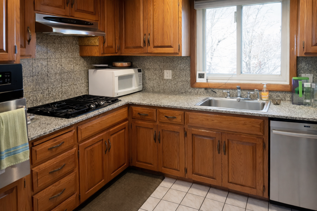 - Scope: Structural expansion, foundation and framing, cathedral ceilings, custom white oak cabinetry, quartzite waterfall island, integrated LED lighting, appliance integration, and finish detailing