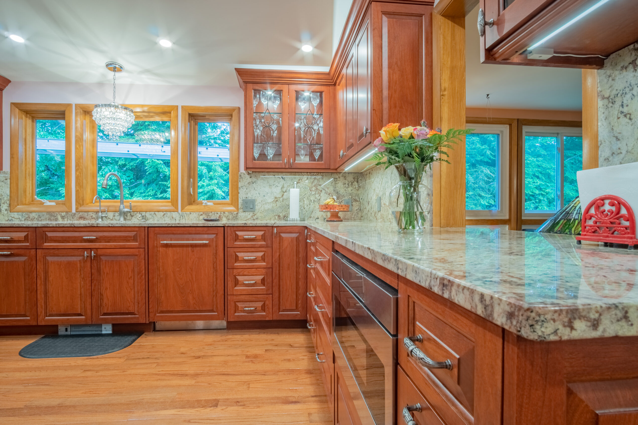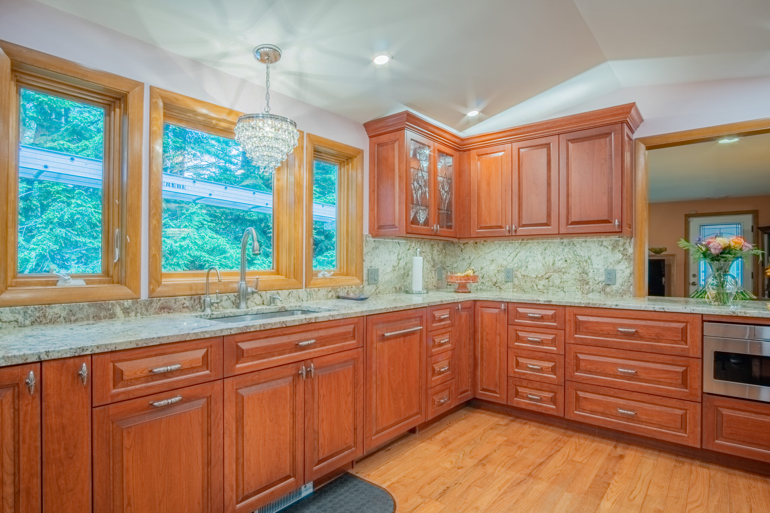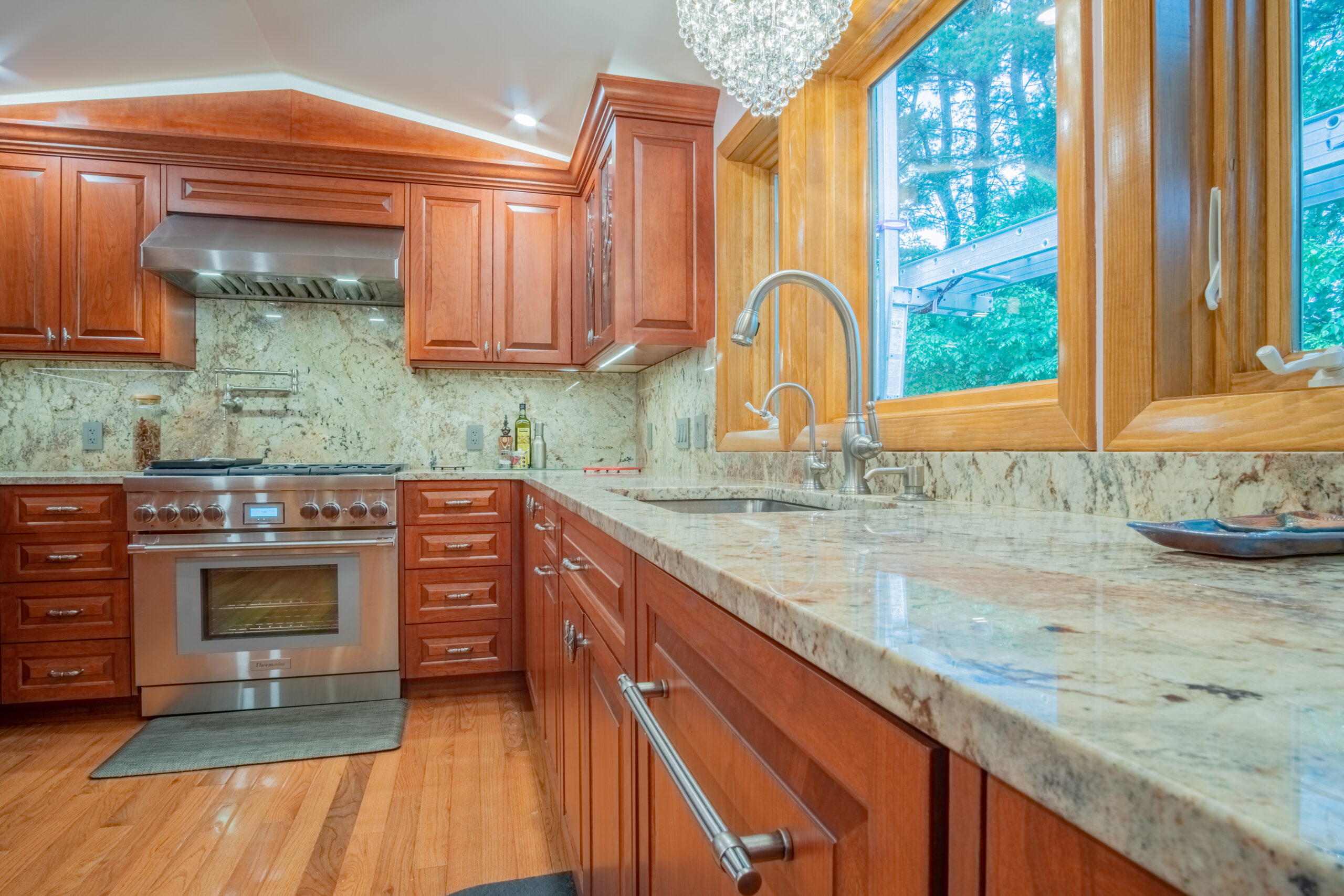 - Highlights: Structural expansion with cathedral ceilings, white oak cabinetry, quartzite waterfall island, integrated LED lighting, professional appliance suite, and a custom breakfast nook.