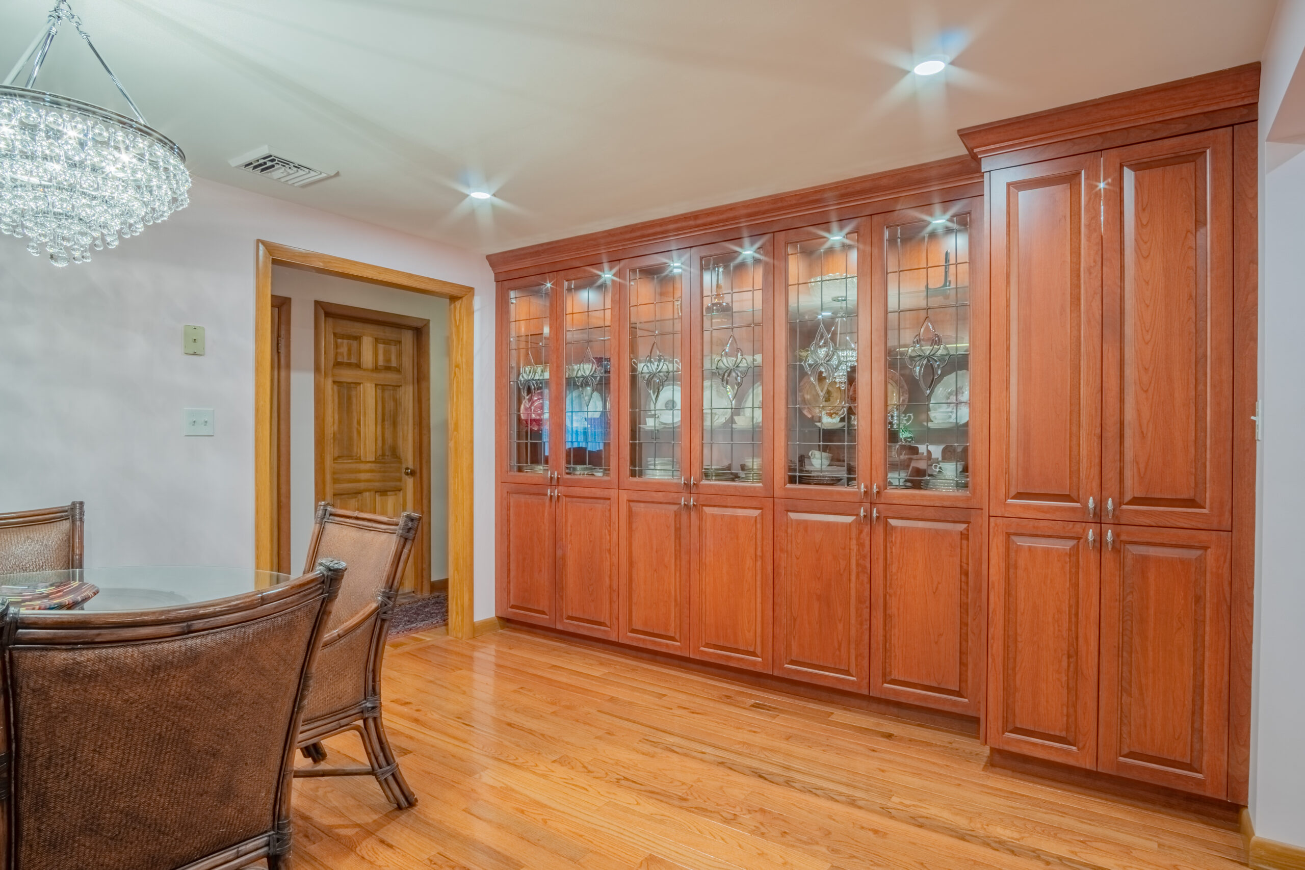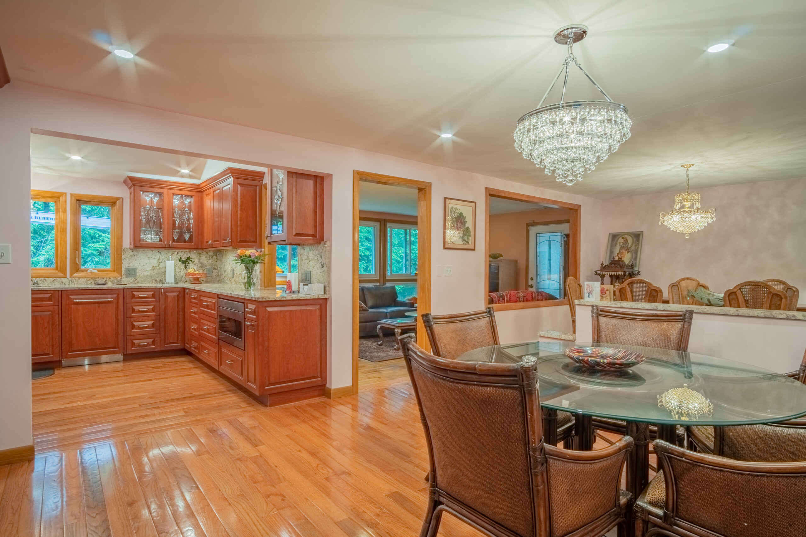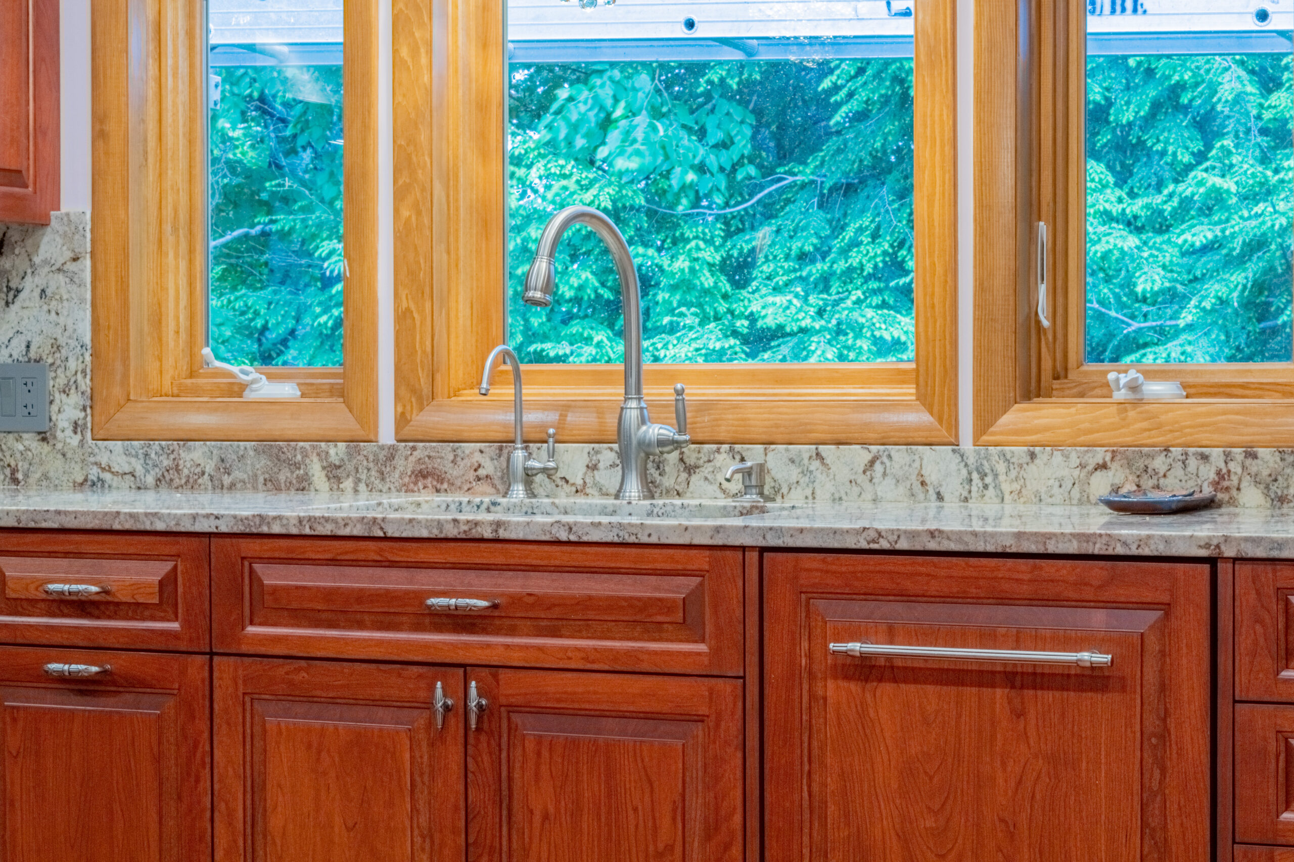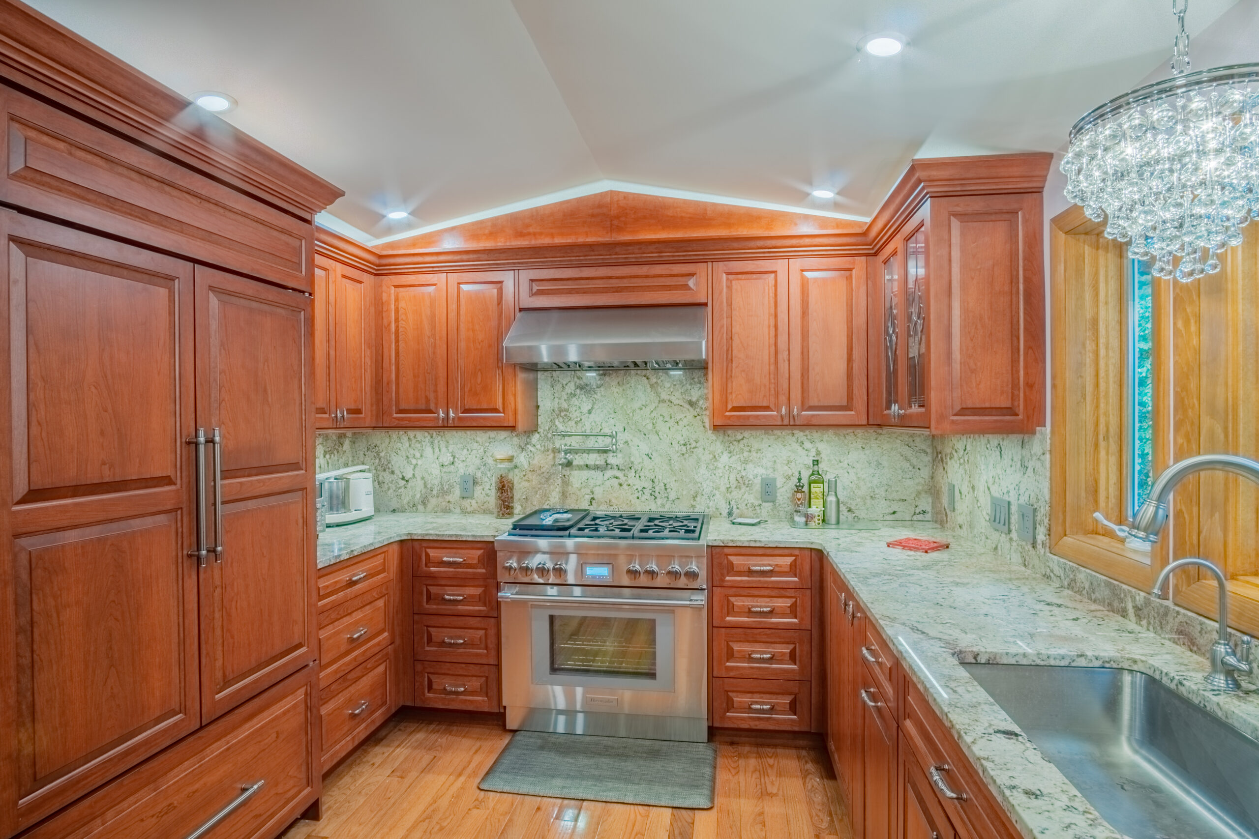 - Highlights: Structural expansion with cathedral ceilings, white oak cabinetry, quartzite waterfall island, integrated LED lighting, professional appliance suite, and a custom breakfast nook.