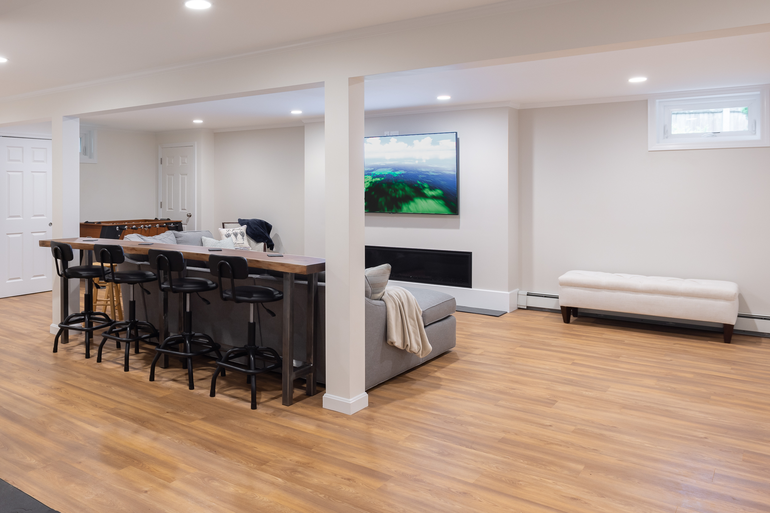 In Beverly, MA, WORKS By JD transformed approximately 850 square feet of basement space into a more functional and refined lower level with custom framing, a dry bar, built-in storage, a gas fireplace, upgraded stairs, vinyl plank flooring, mirrors with brass rail, and detail-driven finish work. The result paired comfort, craftsmanship, and thoughtful space planning to create a polished extension of the home designed for everyday living and entertaining.