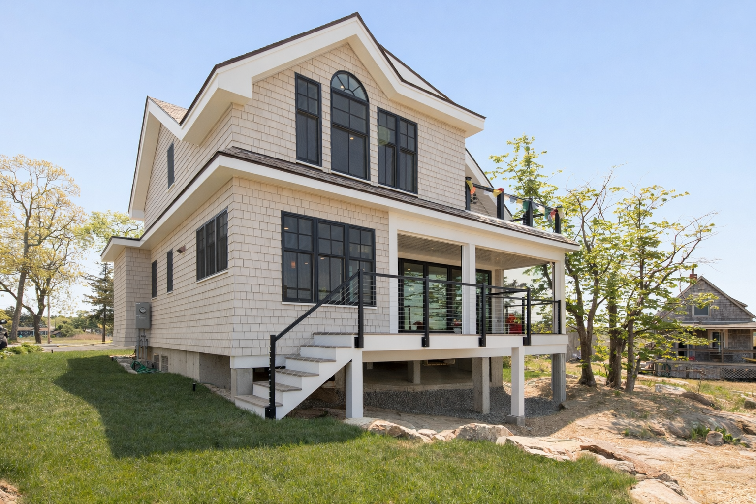 All comparable scopes include architectural planning, coastal engineering coordination, drainage and grading strategy, marine-grade material specification, utility integration planning (gas, water, electric), licensed trades, disciplined site supervision, and a 7-Year Workmanship Warranty.