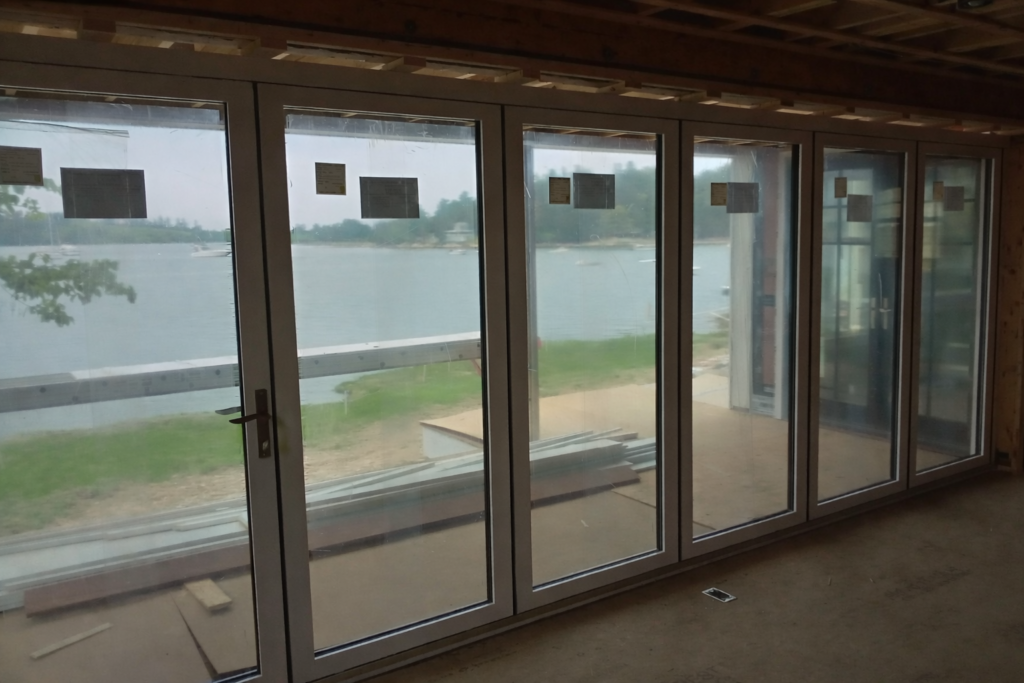 Polished concrete, durable hardwoods such as teak, corrosion-resistant metals, and performance-rated glass systems are commonly used to balance clean modern lines with long-term shoreline durability.