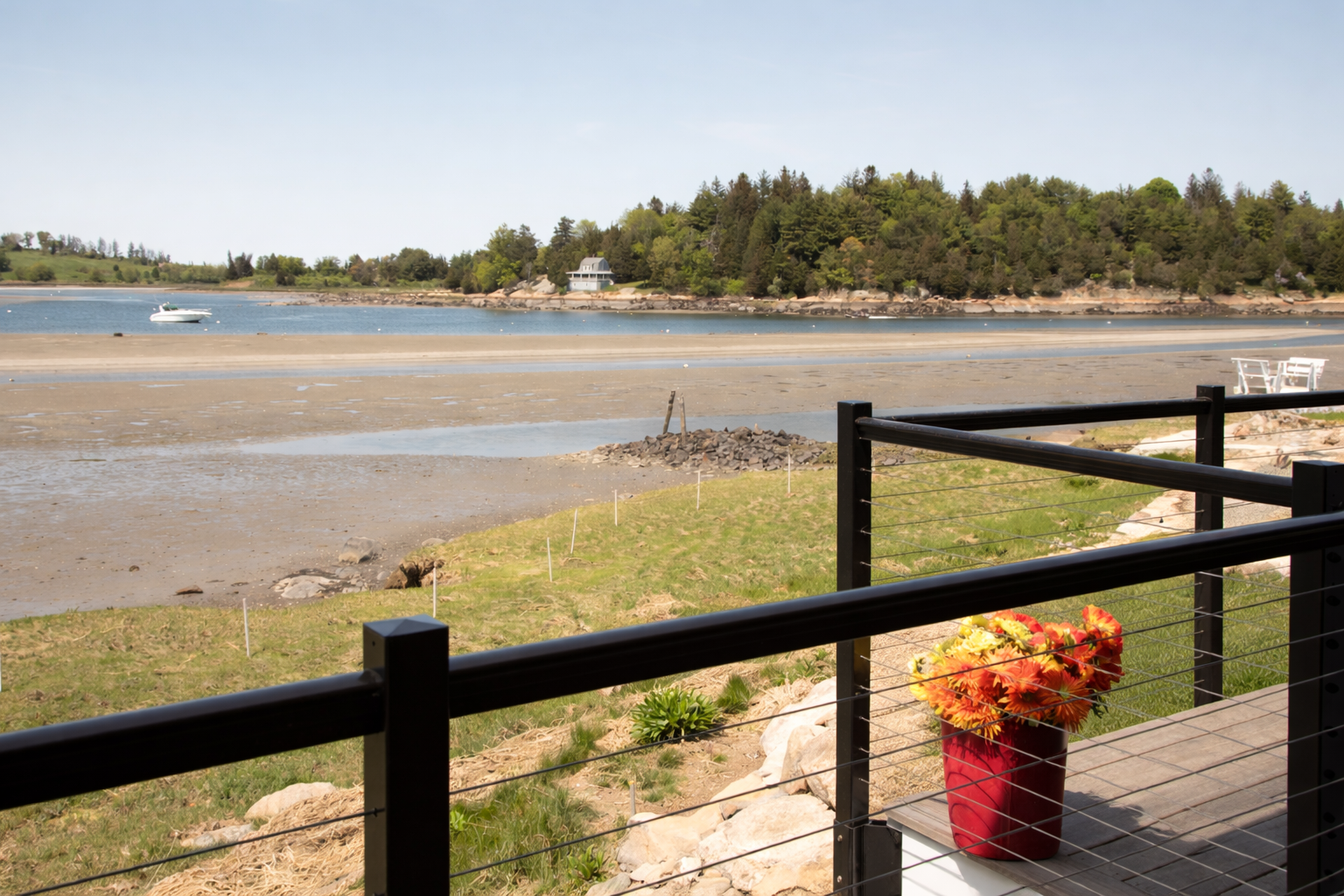 Every element of this Robbins Island modern outdoor design project was executed with geometric discipline and coastal-ready material specification — aligning minimalist architectural lines with shoreline durability requirements while ensuring wind resistance, corrosion management, and long-term performance across New England seasons.